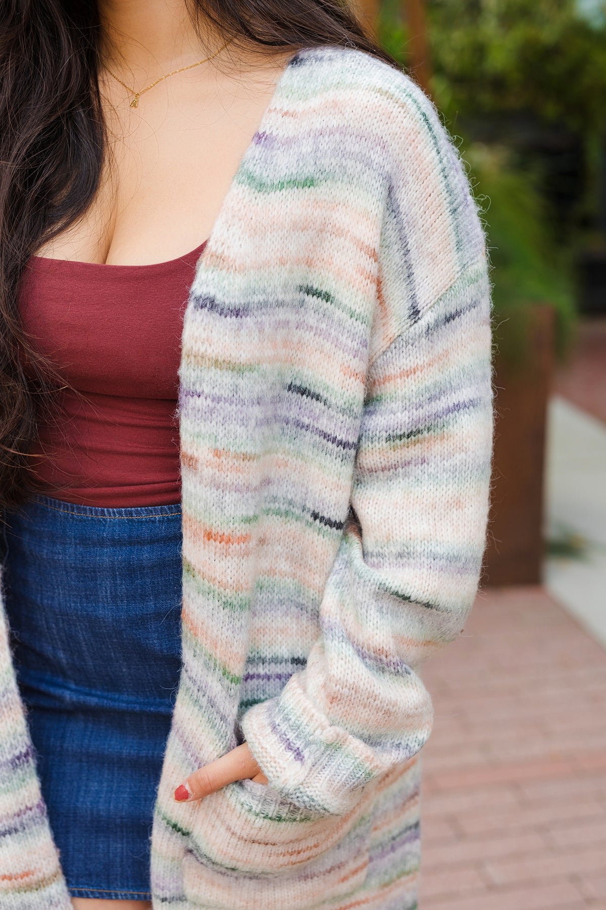 The cardigan you’ll never want to take off. The Hold Me Close Cardigan wraps you in cozy comfort with its dreamy space-dye stripes and soft, wool-blend knit. Designed with a relaxed open front and handy front pockets, it’s that effortless layer you’ll reach for all season long. The mix of warm, muted tones gives it that perfectly lived-in, boho feel we love.