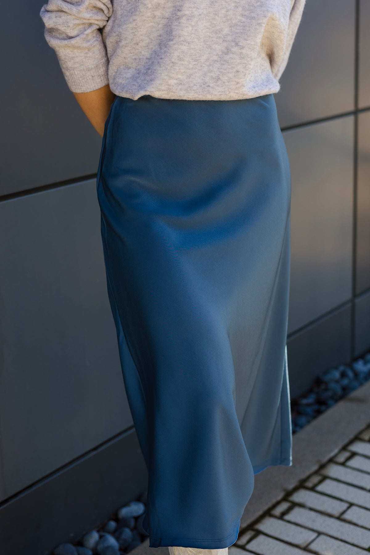 Steal the spotlight in the Meet You At Midnight Blue Satin Midi Skirt ✨ This luxe satin beauty features a flattering mermaid silhouette that softly hugs your curves and flows into a dreamy midi length. Its silky sheen catches the light perfectly — making it a standout piece for date nights, holiday dinners, or girls’ night out.