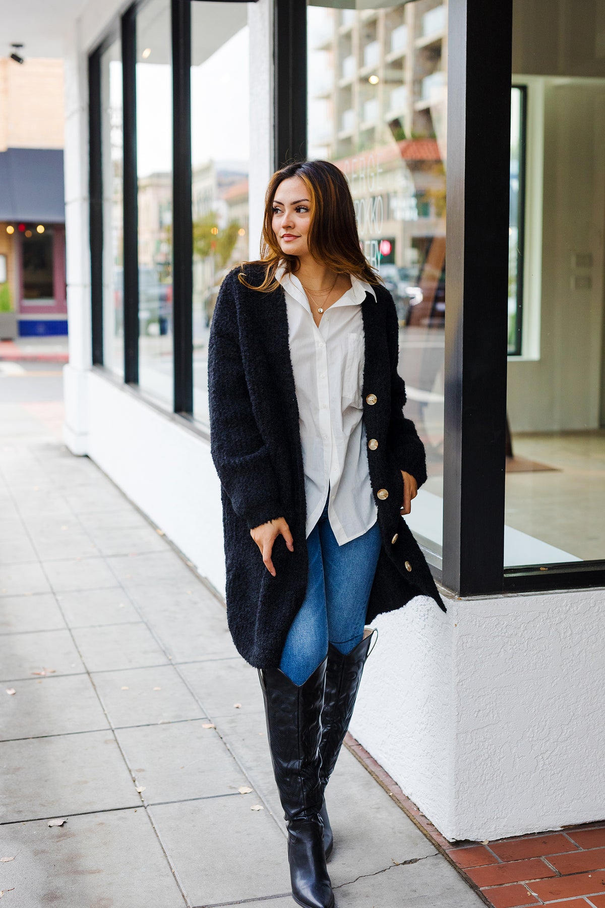Details: Button-front closure, collared neckline, long sleeves, oversized and flowy fit