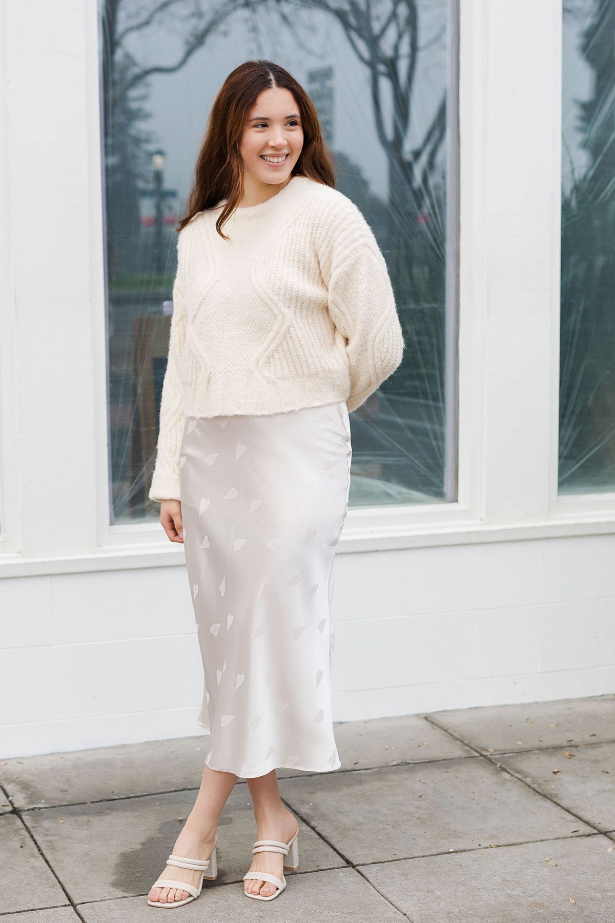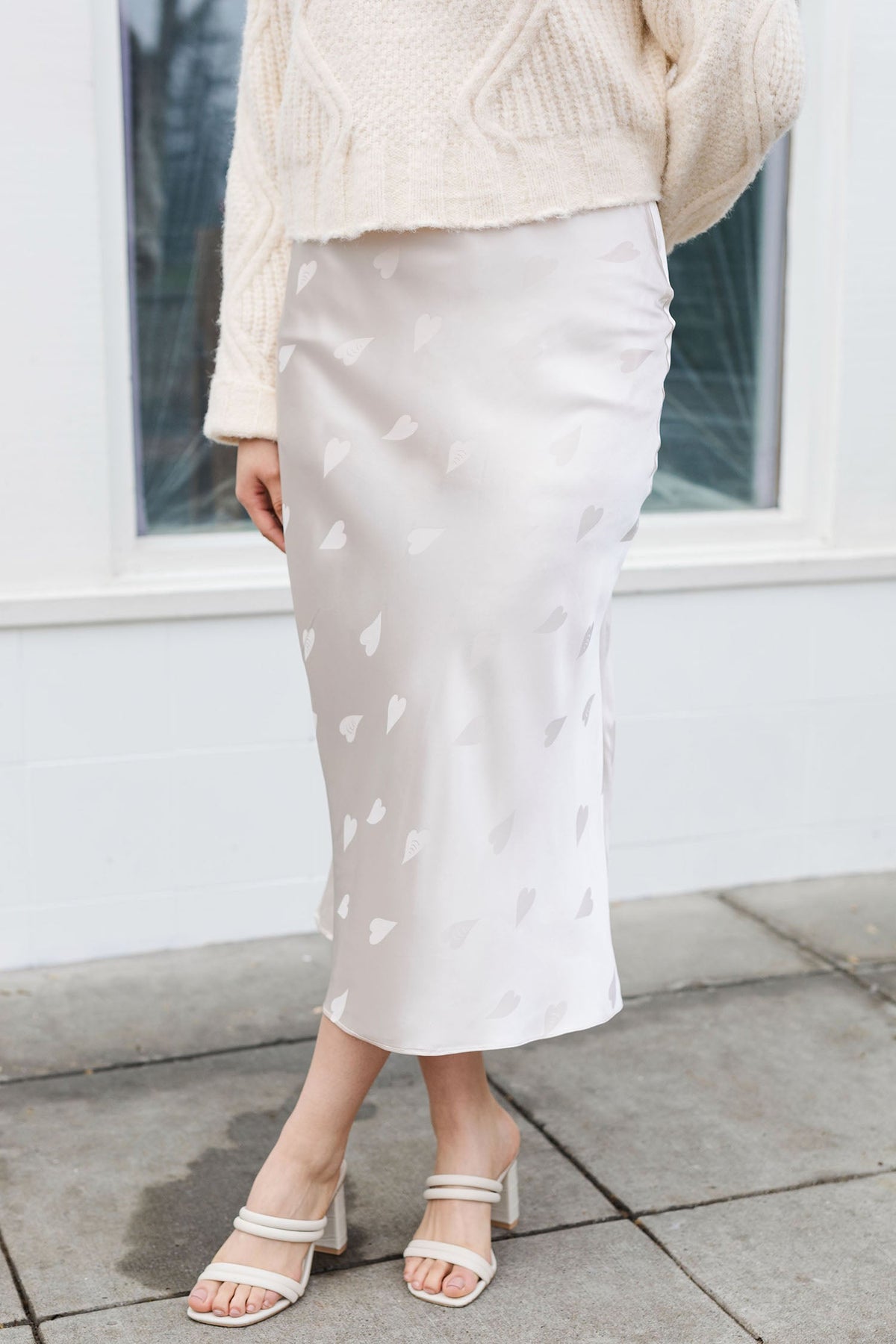Experience pure elegance and comfort with our Sweetest Heart Cream Satin Maxi Skirt. The cream satin material, adorned with a subtle heart print design, will make you feel luxurious and feminine. Elevate your style and embrace your sweetest self in this beautiful skirt.