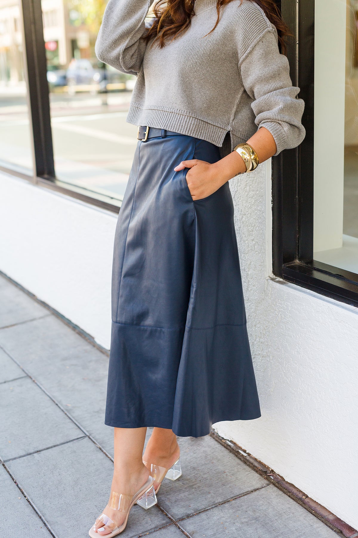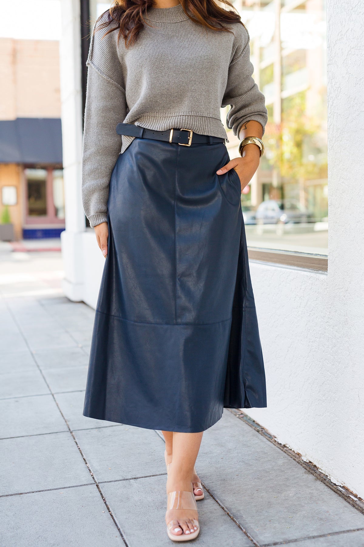 The Midnight Thoughts Faux Leather Midi Skirt is the kind of statement piece that speaks volumes without saying a word. With its flared silhouette, belted waist, and raw-cut hem, this skirt balances edge with effortless sophistication.