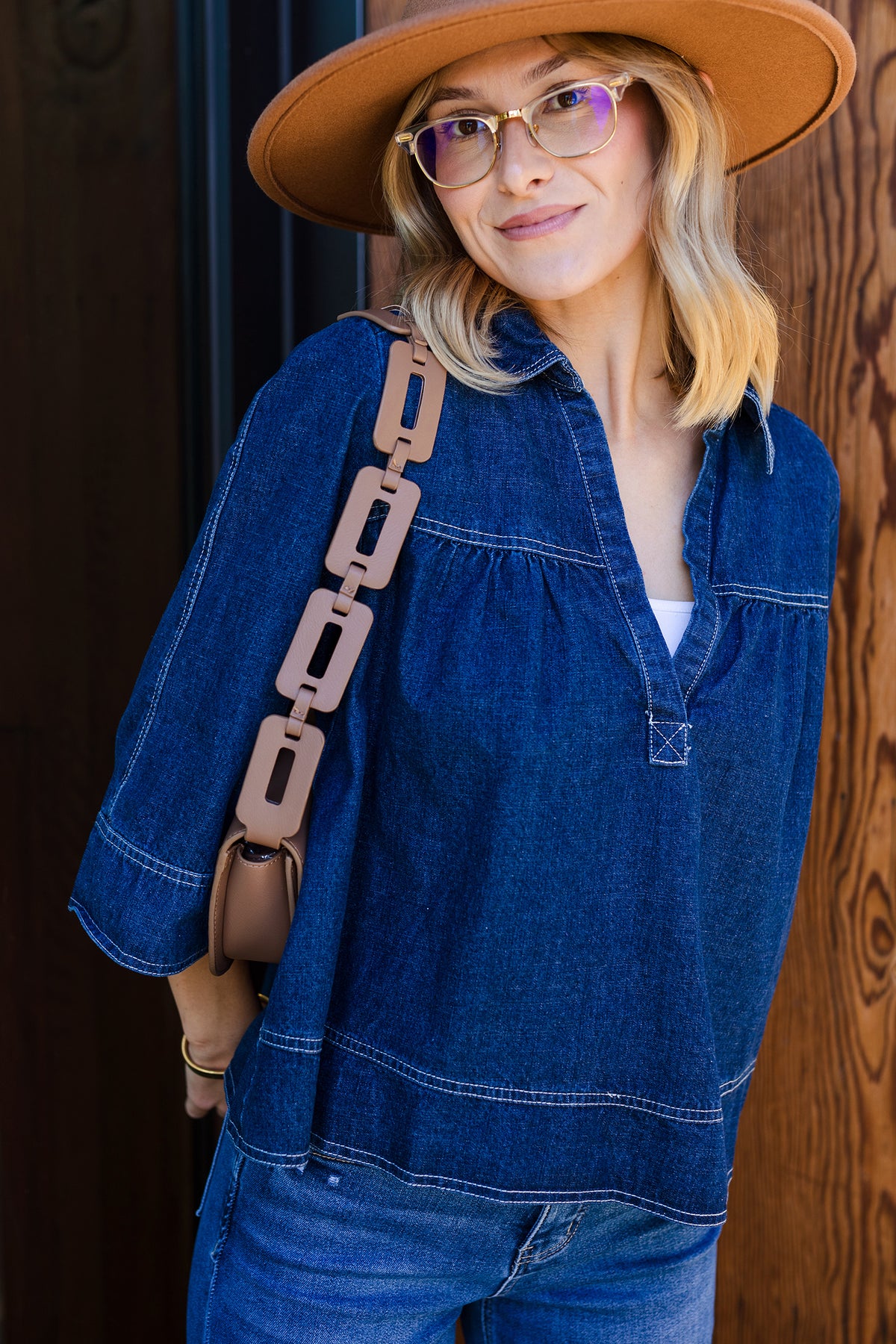 Meet your new go-to denim fave β€” The Full Swing Top! Crafted from 100% cotton, this medium wash denim swing top features a V-neckline, short sleeves, and white contrast stitching that adds the perfect touch of detail. With its easy, flowy fit and timeless vibe, it’s the kind of piece that goes with everything β€” from casual days out to weekend brunch.