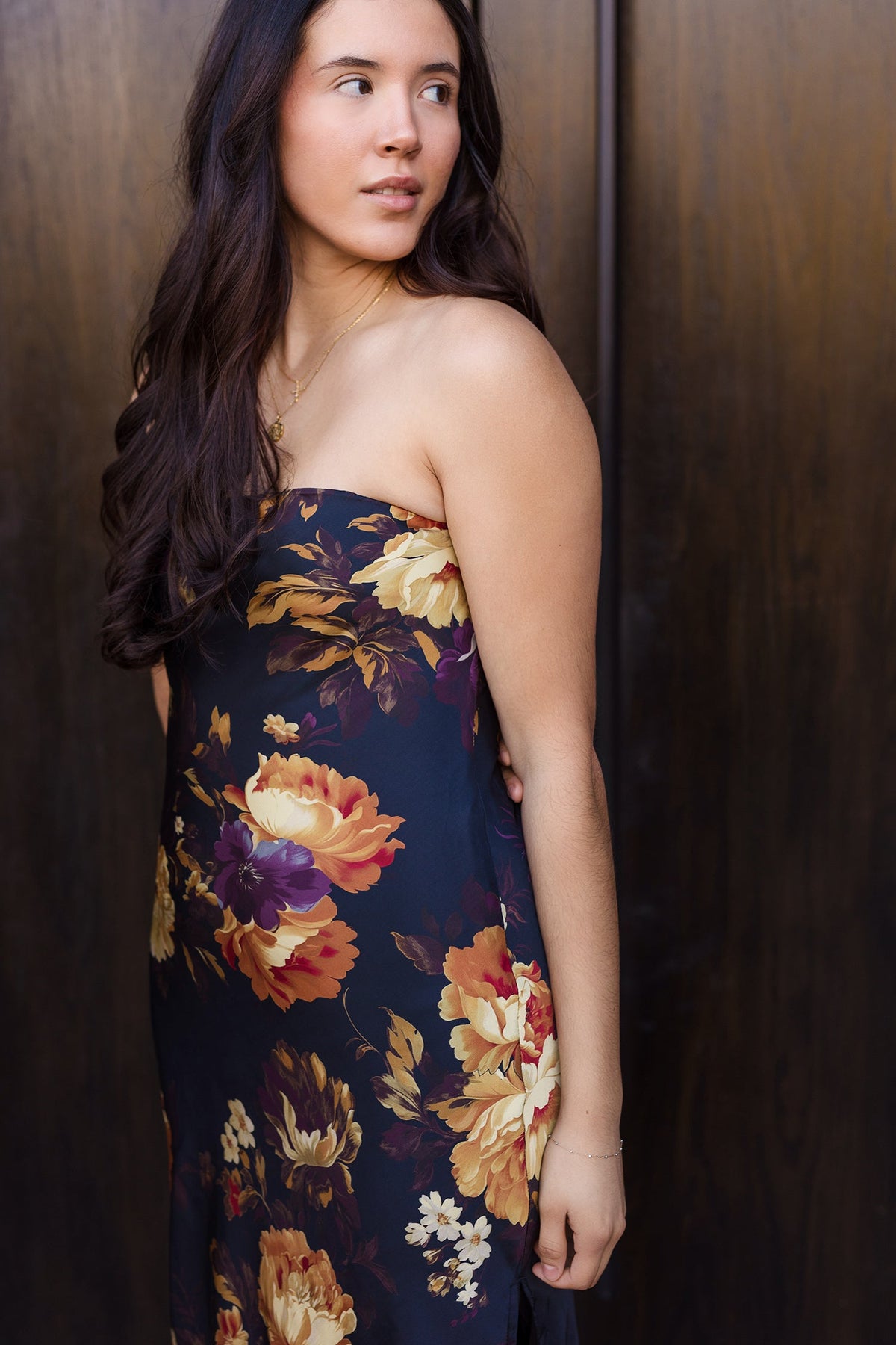 The Midnight Floral Strapless Satin Maxi Dress 🌙🌸