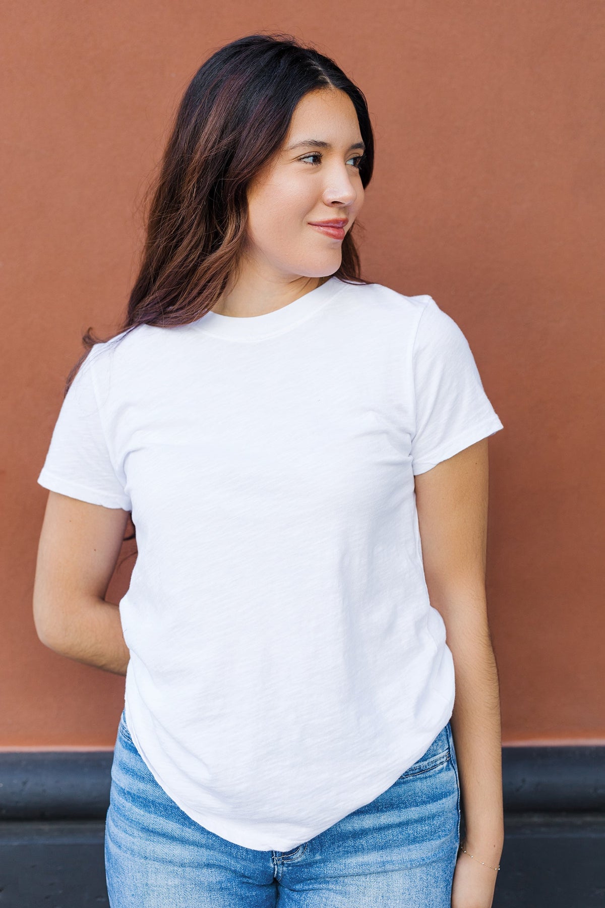 Tags: acid wash t-shirt, white cotton tee, classic crewneck, everyday essentials, vintage-inspired t-shirt, basic short sleeve top, casual summer tops